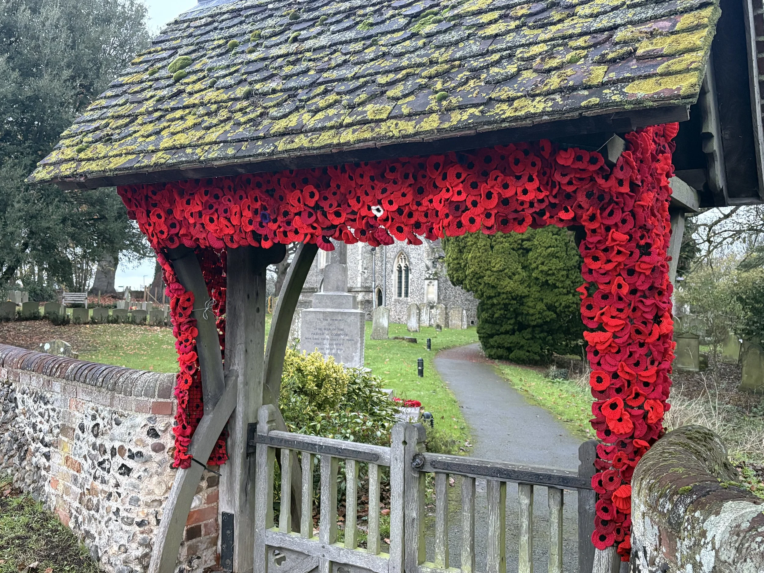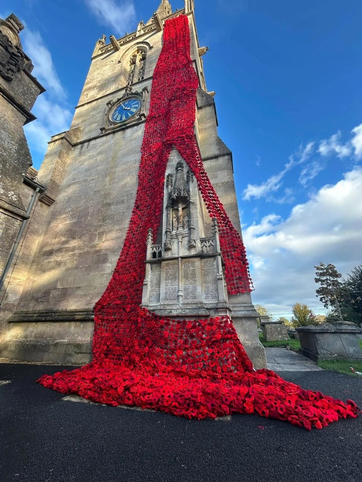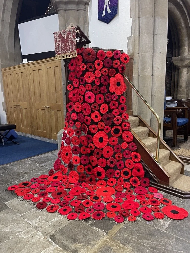 My aunt was a key member of the Peacock Women’s Institute who organised the knitting of 30,000 poppies to decorate various historic buildings including the church and were able to show them to Queen Camilla when she visited.