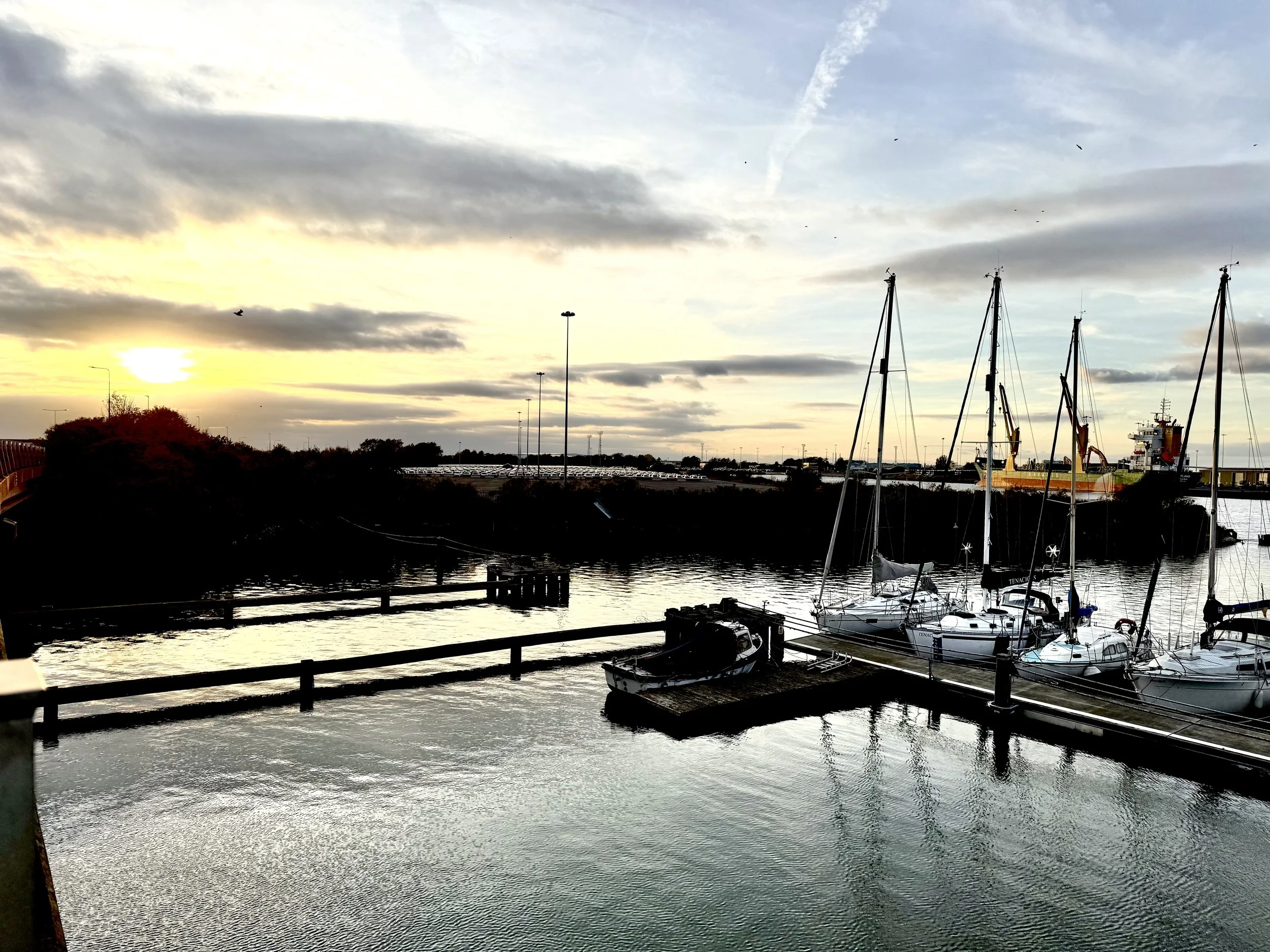 I took this photo while cycling from the vehicle drop off back to Grimbsy Town railway station. At the time, I thought what a great opportunity to capture the setting sun with some of the car storage compounds in the background as well as the sea and boats which make Grimbsy famous.